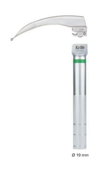 Laryngoskop KaWe w formie kompletu: rękojeść 03.41100.711 + łyżka laryngoskopowa MEGALIHT MACINTOSH F.O. Rękojeść 03.41100.711: kompatybilna z łyżkami spełniającymi normy DIN ISO 7376, mała, światło ksenonowe 2,5 V. Rękojeść dostępna również w wersji 3,5 V. Łyżka laryngoskopowa MEGALIHT MACINTOSH F.O.: oświetlenie światłowodowe o przekroju 3 mmx7.0 mm; wbudowane światłowody; natężenie światła: 6000lux/2,5 V, >13000 lux/3,5 V; dostępne rozmiary: 0, 1, 2, 3, 4.