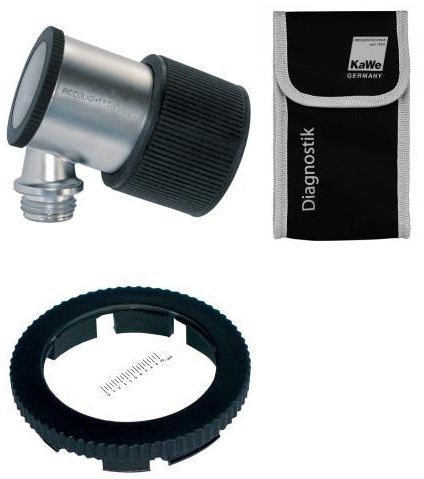Dermatoskop halogenowy z jedną żarówką halogenową powiększeniem 10x krotnym i szkłem kontaktowym 2,5 mm. Powiększenie w zakresie -6 do 3.5 dioptrii. Szkło imersyjne z podziałką. W zestawie trwałe etui na rzep. Brak baterii w komplecie. Rękojeść typu AA plastikowa.
