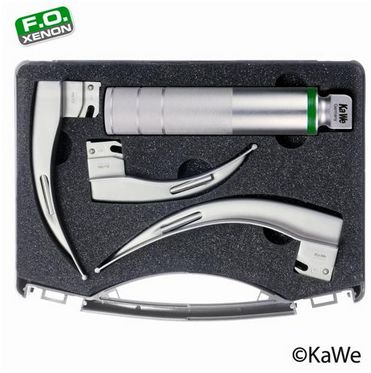 Zestaw Macintosh FO (1 uchwyt, 3 łyżki). Materiał - stal nierdzewna i odporne na refleksy świetlne, światłowód niewymienny O 4,0mm/5500 włókien, poziom jasności > 4200 lux, możliwość sterylizacji do 134°C, około 4000 razy. W zestawie: 1. rękojeść bateryjno- akumulatorowa (średnia), UWAGA!! brak baterii w zestawie. 2. żarówka xenon 2,5 V. 3. 3 łyżki światłowodowe rozmiar 2, 3 i 4. 4. walizka z tworzywa. 5. możliwość doposażenia w: akumulator i ładowarkę.