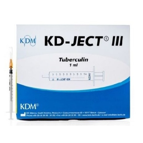 3-częściowa strzykawka tuberkulinowa KD-JECT jednorazowego użytku z igłą o pojemności 1 ml, służy do iniekcji podskórnych.