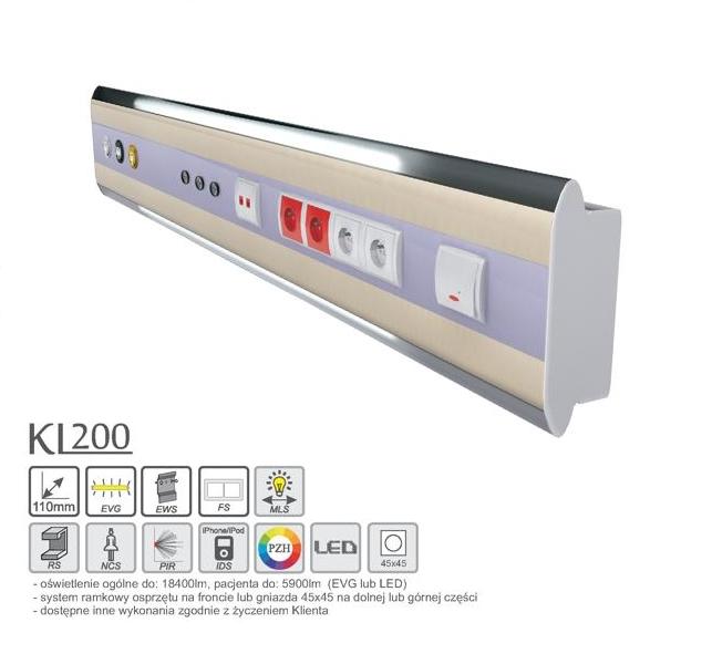 Panel nadłóżkowy z serii Kendro Line Classic. Mocowany do ściany za pomocą specjalnych szyn Easy Wall System (EWS) przyspieszający montaż o 50% oraz ograniczający ilość osób montujących do jednej. Kontrukcja profili umożliwia montaż osprzętu zarówno w płaszczyźnie czołowej panelu lub pod kątem w górnej i dolnej części, systemów licowanych z powierzchnią jak i napowierzchniowych (ramkowych). Dzięki zastosowaniu specjalnych puszek zatrzaskowych (EBA) montaż i demontaż elementów instalacji i osprzętu jest bardzo prosty oraz nie wymaga odkręcania żadnych śrub. Ponadto niniejsza seria przystosowana jest do instalacji dowolnych punktów poboru, dowolnej mocy i typu oświetlenia (do 25600 lm) oraz szyn do zawieszania osprzętu medycznego (RS). Do wyposażenia dodatkowego mozemy zaliczyć stację dokującą do Ipod/Iphone (IDS), system mobilnego oświetlenia łóżek pacjenta (MLS), gniazda i manipulatory (z wymiennymi jednrazowymi pokrowcami) systemów przywoławczych różnych procedur (NCS), czujniki ruchu oraz czujniki oświetlenia (PIR) dostosowującycmi natężenie oświetlenia do zadaniej wartości. Wyposażenie standardowe: długość 1600 mm; głebokość 110 mm; punkt poboru tlenu i próżni; oświetlenie sali świetlówka 2G11 2x36W EVG; oświetlenie pacjenta świetlówka 2G11 1x24W EVG; oświetlenie nocne świetlówka G23 1x7W EVG; 4xgniazdo 230 V ramkowe; 2xgniazdo ekwipotencjalne; otworowanie pod instalację przyzywową;. Wyposażenie dodatkowe: oświetlenie ogólne do: 18400lm, pacjenta do: 5900lm (EVG lub LED); system ramkowy osprzętu na froncie lub gniazda 45x45 na dolnej lub górnej części.