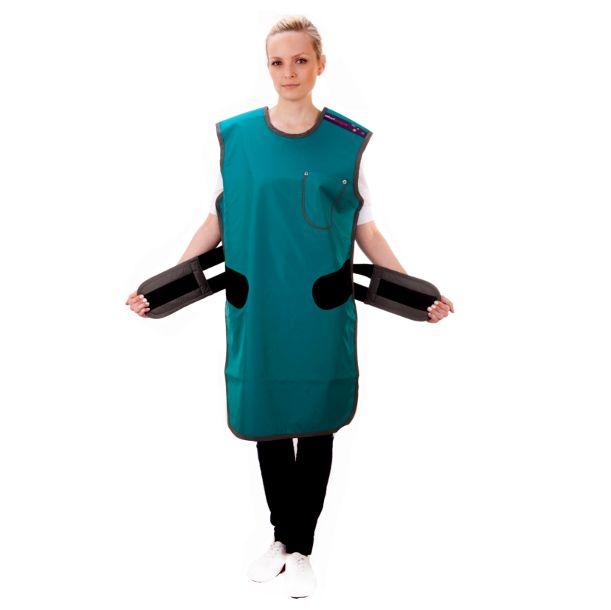 Fartuch ochronny przed promieniowanie rentgenowskim X. Jednostronny ołowiany w stylu komfort. Ekwiwalent ołowiu 0,25 mm Pb. Przeznaczony do noszenia podczas procedur operacyjnych z wykorzystaniem aparatury rentgenowskiej. Wyściełane ramiona fartucha ochronnego zastosowano w celu zredukowania ucisku na ramię i równomiernego podziału masy.
