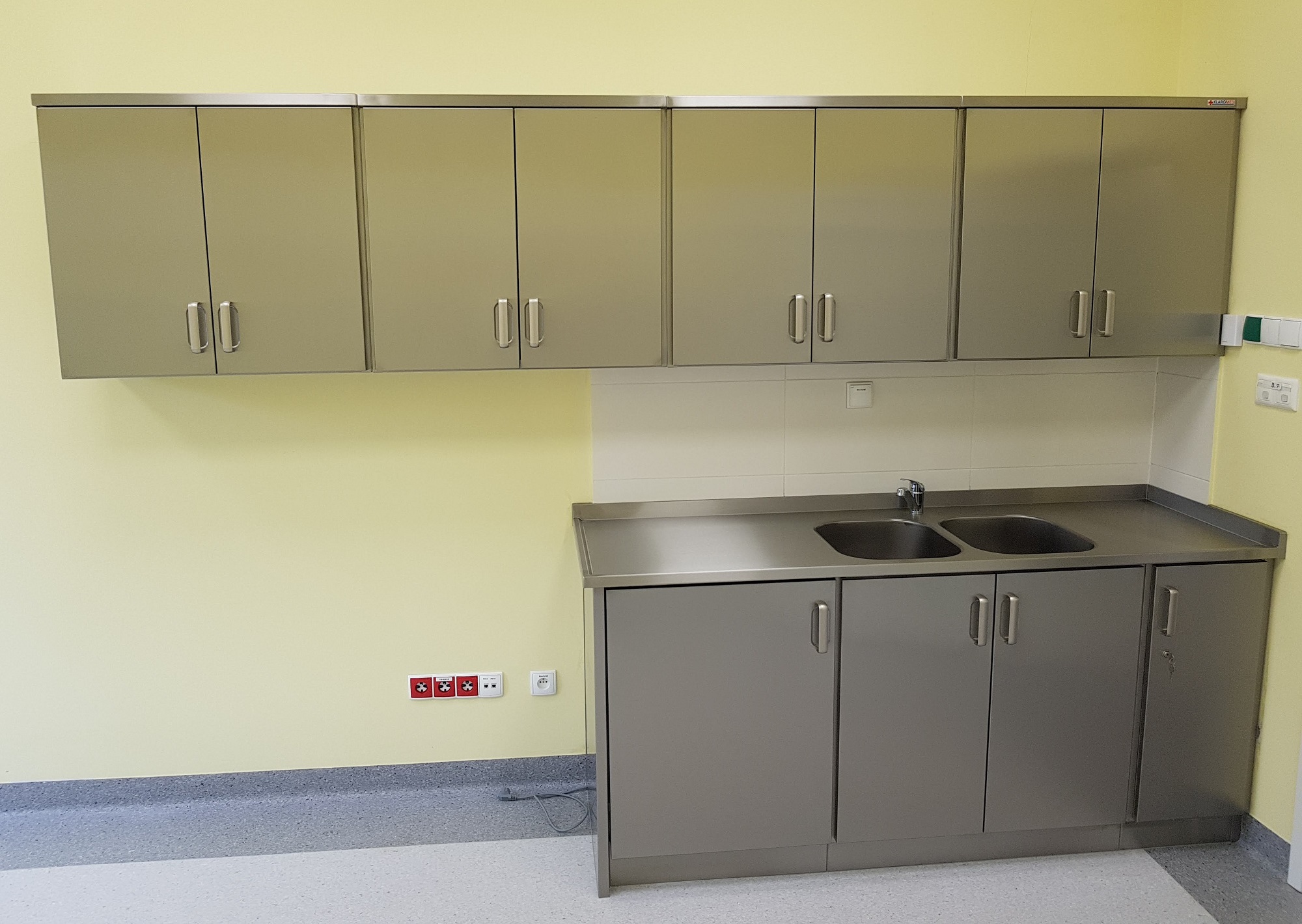 Metalowe meble medyczne ze stali kwasoodpornej to doskonałe, wysokiej jakości wyposażenie dedykowane przede wszystkim do szpitali. Posiadają certyfikat Systemu Zarządzania Jakością – ISO 13485: 2016. W całości zostały wykonane ze stali kwasoodpornej OH18N9, w systemie podwójnej ścianki, z wypełnieniem usztywniająco-wygłuszającym. Meble są odporne na wilgoć. Blaty robocze wykonano ze stali kwasoodpornej lub kompozytowego konglomeratu mineralnego z listwami przyściennymi.