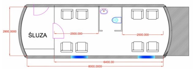 • Gabinet „Kapsuła Natury” wymiary wewnętrzne: wysokość od podłogi 2300 mm, dł 8000mm, Wymiary zewnętrzne fi 3200mm, wysokość 3400mm, długość całkowita ok 9700 mm (wraz z maszynownią i ociepleniem )
