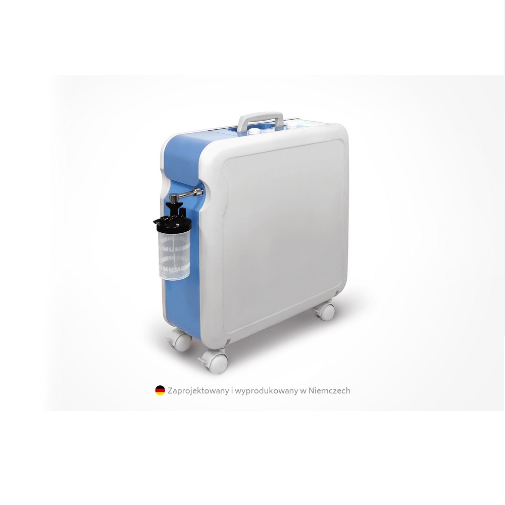 Koncentrator tlenu wyprodukowany w Niemczech. Niewielka , kompaktowa obudowa (w formie walizki). Rewelacyjnie cichy - tylko 31dB! Niewielka waga (16 kg). Niskie zużycie energii elektrycznej 280W. Przepływ tlenu płynnie regulowany 0-4l/min (za pomocą w pełni elektronicznego przepływomierza). Komputerowy system samodiagnozujący (wyświetlacz LCD). Pełna diagnoza za pośrednictwem wbudowanego portu USB. Technik jest w stanie sprawdzić urządzenie w ciągu minuty! Sprzęt firmy Kröber mającej ponad 25 letnie doświadczenie w produkcji rozwiązań do tlenoterapii z "najwyższej półki".