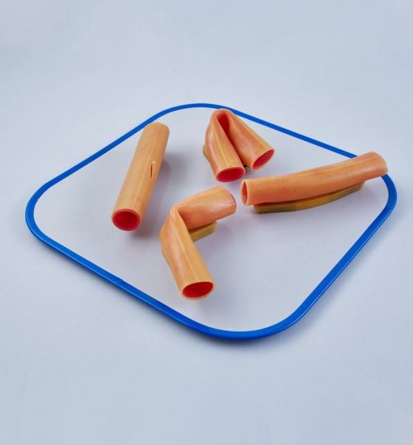 Zestaw ćwiczeniowy składa się z dwóch odcinków dwuwarstwowego jelita cienkiego przymocowanego na nóżce imitującej kreskę. Zadaniem jest zespolenie każdej z warstw „mięśniówki” po obwodzie jelita.