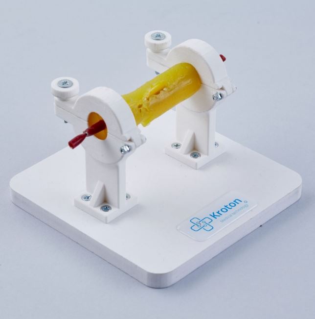 Wewnątrz żółtego walca znajduje się rureczka wypełniona sztuczną krwią .Ćwiczenie polega na mechanicznym wypreparowaniu rureczki. Następnie należy ją zaklipsować i przeciąć.
