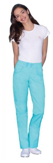 Eleganckie spodnie z flirtującymi, zaokrąglonymi koronkami przy kieszeniach frontowych oraz tylnich.Szeroki wszywany pasek w talii z zapięciem na cztery guziki oraz elastyczną wstawką w tylnej części. Dopasowane do naturalnych kształtów. Zamek błyskawiczny. Głęboki rąbek oraz nogawki skrojone specjalnie do chodaków i niewysokich butów.
