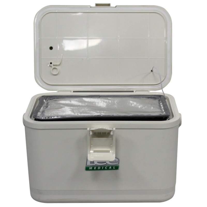 Przenośna chłodziarka do szczepionek o pojemności 8 l z foliową wyściółką i żelowymi opakowaniami wielokrotnego użytku.