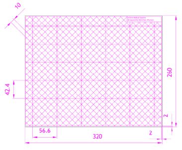 Fantom (wzorzec siatki) wykonany jest z PMMA, Nacięcia wykonane laserem i wypelnione farbą dają niskokontrastowe cienie linii przebiegających w kierunkach prostopadłych i diagonalnie. Fantom spełnia wymagania wytycznych europejskich – Updated version of European Breast Tomosynthesis QC Protocol, (ver. 1.03)