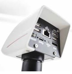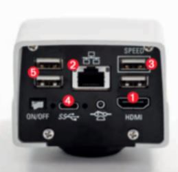Zapewnia rejestrację obrazów wysokiej rozdzielczości jak również transmisję obrazu live w rozdzielczości 4K – zarówno przez port HDMI (1), port sieciowy (2) czy też podłączany do kamery router WiFi ! Z tego względu doskonale nadaje się również do celów szkoleniowych. Kamera może współpracować zarówno z komputerem (4) jak i pracować całkowicie niezależnie zapisując zdjęcia na pendrive podłączany poprzez port USB (5) z tyłu kamery. Kamera współpracuje również z najnowszym oprogramowaniem LAS X wraz z dedykowanymi modułami.