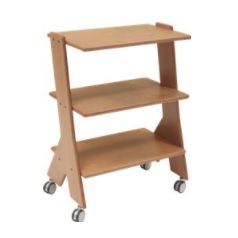 Stolik na urządzenia i akcesoria kosmetyczne, wykonany w całości z drewna, na kółkach.