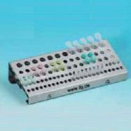 Stal nierdzewna 18/10. Ukośne statywy odpowiednie do przechowywania probówek: 48 x 0,2 ml_ (PCR) lub pasków po 8 lub 12 probówek, 30 x 0,5 mL, 12 x 1,5 mL lub 12 x 2 mL. Możliwość sterylizacji promieniami UV lub sterylizacji w autoklawie (200°C), idealne do stacji roboczych do PCR. 220 x 95 mm (dł. x szer.); 20/45 mm (wys. przód/tył).