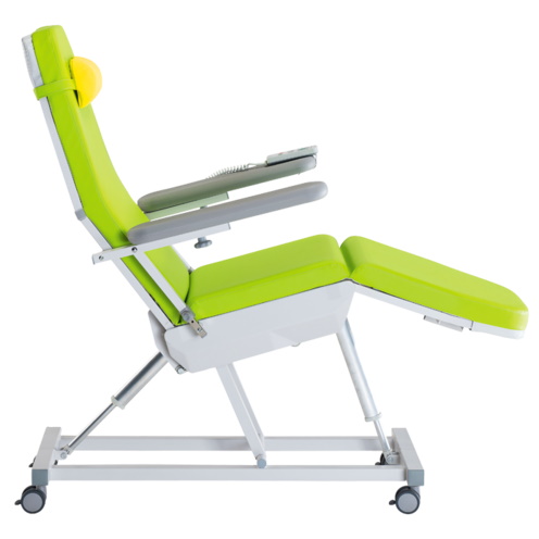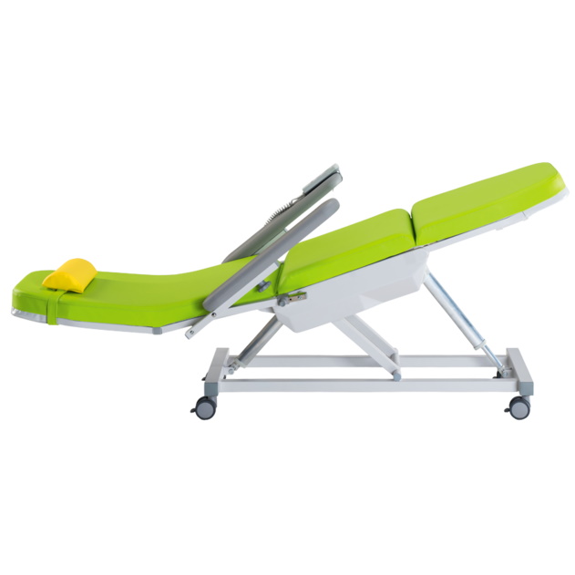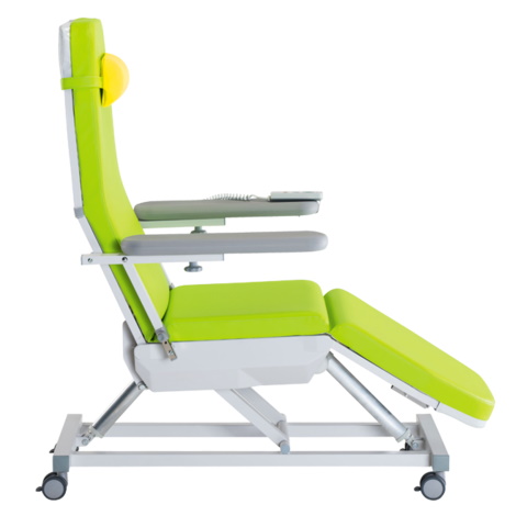 SALSA® A4 to najbardziej funkcjonalny fotel zabiegowy wykorzystywany w procesach chemioterapii, podawania cytostatyków, wykonywania dializy oraz transfuzji krwi z linii SALSA® . Fotel wyposażony jest w regulowany mechanicznie podnóżek oraz wygodne podłokietniki, które można odchylać i składać do góry. Anatomicznie wyporofilowane leże zapobiega zsunięciu się pacjeta z fotela podaczas zabiegów w pozycji leżacej. Cztery silniki elektryczne zapewniają regulację części oparcia, siedziska, nóg i wysokości. Przewodowy pilot sterujący, z funckją blokady magnetycznej, posiada oddzielne przyciski, za pomocą których uzyskujemy pozycję fotelową oraz pozycje szokową lub Trendelenburga. Fotel SALSA® A4 to fotel szyty na miarę komfortu i bezpieczeństwa.