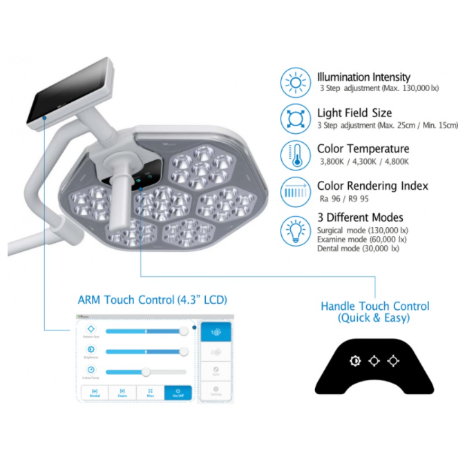 Lampa zabiegowo-operacyjna dwuczaszowa S300DC sufitowa z regulacją natężenia światła, regulacją temperatury barwowej oraz regulacją pola roboczego.