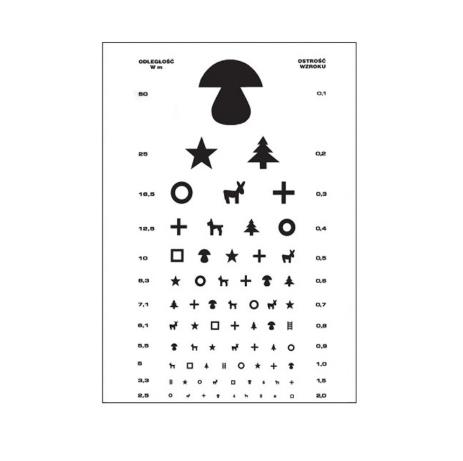 Tablica Snellena obrazki grzybek PCV to przyrząd do wykonywania badania optometrycznego. W trakcie badania pacjent staje w odległości 6 metrów od tablicy. Tablica składa się z dwunastu rzędów obrazków, a najmniejszy rząd, który pacjent jest w stanie odczytać z tablicy określa ostrość wzroku pacjenta w danym oku. Tablica wykonana z PCV. Gwarancja producenta wynosi 12 miesięcy.