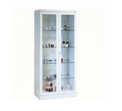 Korpus szafy wykonany z blachy gr. 0,8 mm. Drzwi szafy przeszklone, półki wykonane ze szkła, przestawne co 25 mm. Uchwyt drzwiowy z zamkiem zabezpieczającym ryglującym drzwi w dwóch punktach.