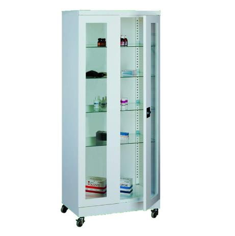 Szafa lekarska dwudrzwiowa na kółkach SML 102 funkcjonalna i estetyczna stanowi znakomity element wyposażenia gabinetów lekarskich. Drzwi ze szkłem hartowanym są bezpieczne, szafa jest wyposażona w cztery szklane półki, które można przestawiać co 25mm. Drzwi posiadają zamek zabezpieczający, który rygluje drzwi w dwóch miejscach zapewniając tym samym większe bezpieczeństwo. Szafa umieszczona jest na 4 kółkach z czego dwa z nich posiadają hamulce. Gwarancja producenta wynosi 24 miesiące.