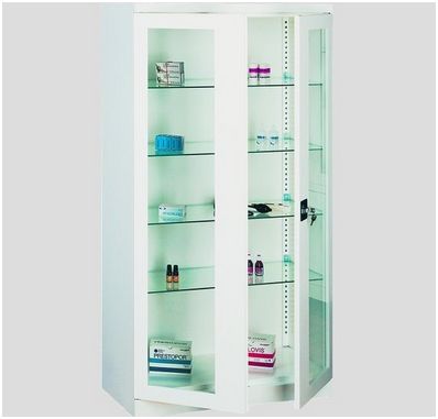 Korpus szafy wykonany z blachy gr. 0,8 mm. Drzwi szafy przeszklone, półki wykonane ze szkła, przestawne co 25 mm. Uchwyt drzwiowy z zamkiem zabezpieczającym ryglującym drzwi w dwóch punktach.