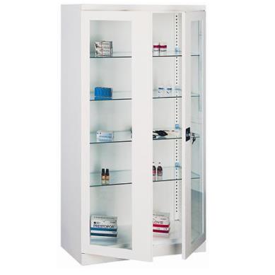 Szafa lekarska dwudrzwiowa SML 112 funkcjonalna i estetyczna stanowi znakomity element wyposażenia gabinetów lekarskich. Drzwi ze szkłem hartowanym są bezpieczne, szafa jest wyposażona w cztery szklane półki, które można przestawiać co 25mm. Drzwi posiadają zamek zabezpieczający, który rygluje drzwi w dwóch miejscach zapewniając tym samym większe bezpieczeństwo. Gwarancja producenta wynosi 24 miesiące.