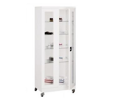 Korpus szafy wykonany z blachy gr. 0,8 mm. Drzwi szafy przeszklone, półki wykonane ze szkła, przestawne co 25 mm. Uchwyt drzwiowy z zamkiem zabezpieczającym ryglującym drzwi w dwóch punktach.