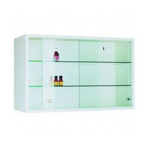Szafka wisząca z drzwiami przesuwnymi. Drzwi i półki wykonane ze szkła.