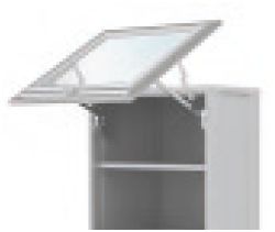 Szafka zamknięta z jedną półką otwierana do góry ze szklanymi drzwiczkami.