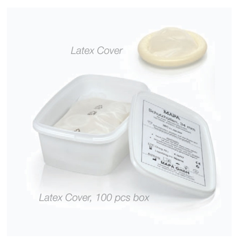 Osłonka na głowicę USG, mikrobiologicznie czysta, gotowa do użytku, sucha, z ekologicznego lateksu, średnica 34 mm, możliwość rozciągniecia do 18 cm, wyrób medyczny klasy 1. Pakowana w woreczku po 100 szt i w higieniczne pudełko z otwarciem.