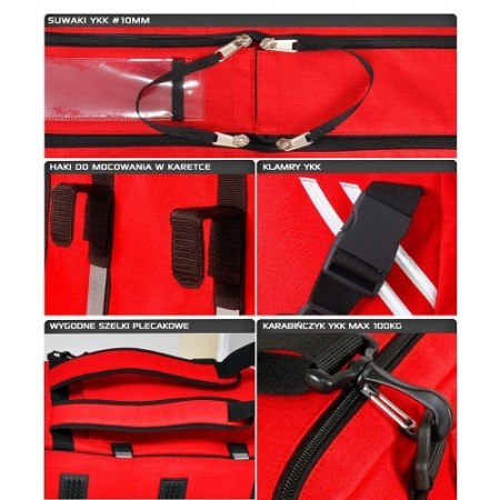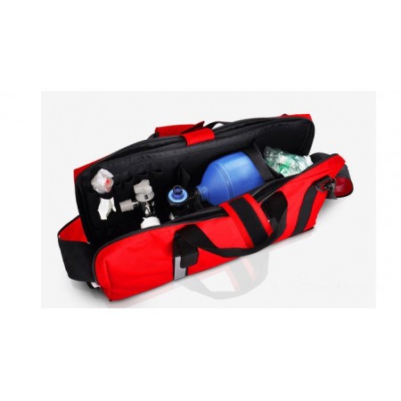 Zestaw ratowniczy z inhalatorem tlenowym znajduje się w wytrzymałej torbie wykonanej z powlekanego materiału CORDURA. Posiada ona 6 uchwytów na rurki intubacyjne. Została wyposażona w szyny niezbędne do mocowania torby na noszach oraz wygodne szelki, dzięki czemu torbę można nosić także jak plecak. Uchwyt torby jest spinany rzepem, co zapewnia pewny i komfortowy chwyt. Wszystkie elementy wykorzystane przy tworzeniu torby odznaczają się doskonałymi parametrami użytkowymi, dzięki czemu są odporne na uszkodzenia mechaniczne i warunki atmosferyczne. Precyzyjnie zaplanowane wyposażenie zestawu zapewnia dogodne warunki świadczenia pierwszej pomocy. Inhalator tlenowy jest rekomendowany przez ratowników medycznych.