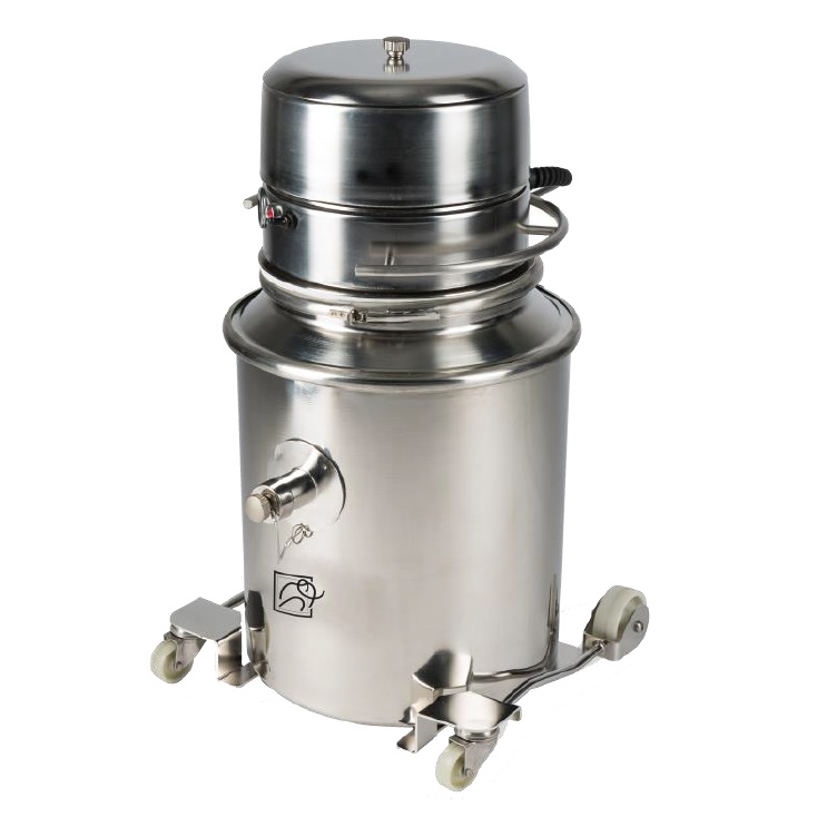 Zebrany materiał trafia do 40 litrowego (25 litrów na płyny) polerowanego pojemnika ze stali nierdzewnej AISI 316, który umieszczony jest na kółkach umożliwiających łatwą i bezpieczną utylizację odpadów, również bezpośrednio do worków. Zbiornik umieszczony jest na wytrzymałej ramie ze stali nierdzewnej AISI 304. Poza głowicą silnika, wszystkie podzespoły ze stali nierdzewnej zostały wysterylizowane w autoklawie (do 120°C).