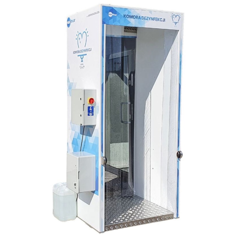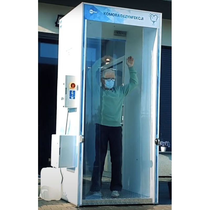 Komora wykonana została na konstrukcji stalowej w obudowie z poliwęglanu spienionego. Urządzenie działa automatycznie, po wejściu do komory samoczynnie uruchamia się proces dezynfekcji - zamgławianie ciała użytkownika sygnalizowany migającym czerwonym sygnałem świetlnym. Po zakończeniu etapu dezynfekcji pojawia się sygnał zielony. Opisywana procedura dezynfekcji w komorze nie wymaga zdejmowania odzieży wierzchniej.