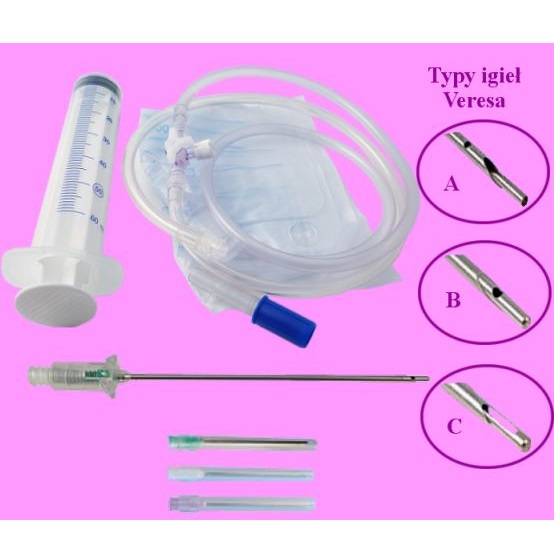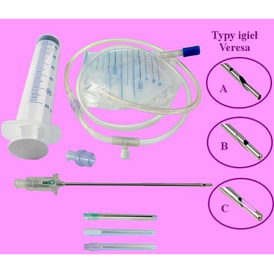 zestaw z 3 igłami typu lancet (14G, 16G, 18G) lub z igłą Veresa (w trzech różnych wersjach)