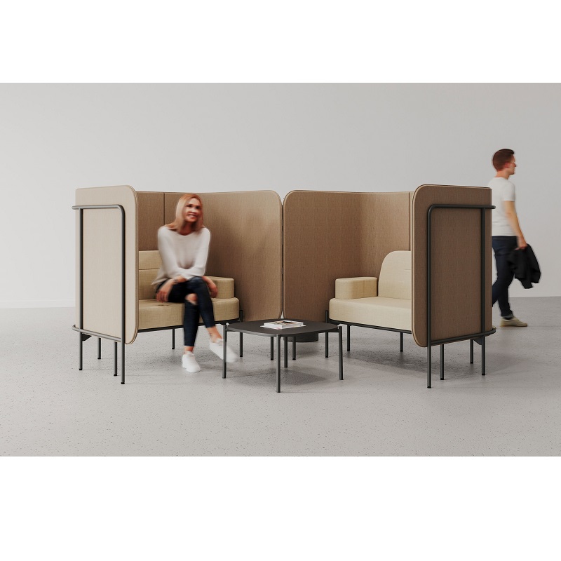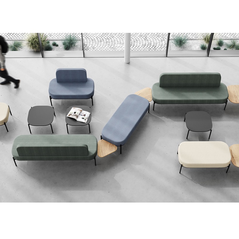 Wszystkie konstrukcyjne elementy stalowe są lakierowane i dostępne w 3 kolorach RAL, podobnie jak funkcjonalne akcesoria które wzbogacają funkcjonalnie całą kolekcję. Cokoły sof i zaślepki nóżek opcjonalnie mogą być wykonane z drewna jesionowego w różnych wybarwieniach . Stoliki lub blaty łączące stanowią funkcjonalny dodatek do sof; z możliwością zamówienia z mediaportem.