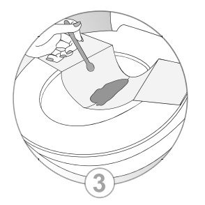 4. Po zebraniu próbki kału należy uwolnić powierzchnie klejące z deski sedesowej i wyrzucić koszyczek ułatwiający pobieranie do toalety.