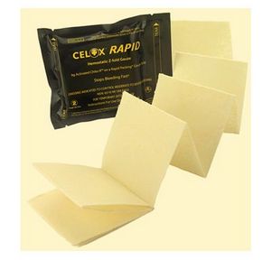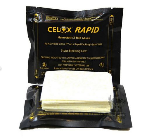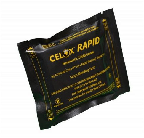 CELOX™ RAPID jest następcą produktu CELOX GAUZE i CELOX GAUZE Z-FOLD. Jeszcze szybsze działanie gwarantuje większa ilość środka hemostatycznego, dzięki czemu tamowanie krwotoku następuje już ok 1-2 min po użyciu. Zastosowany układ materiału nośnego pozwala na zmniejszenie objętości opatrunku przy zachowaniu skuteczności tamowania krwotoków. Krótsza gaza składana warstwowo ułatwia stosowanie i skraca czas aplikacji opatrunku. Łatwe do przechowywania opakowanie w kolorze maskującym zawiera jeden pasek gazy o długości 150 cm złożonej warstwowo.