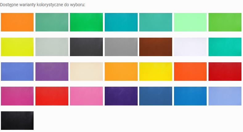 Dostępna pełna paleta barwna (ponad 30 kolorów) atestowanego materiału polskich producentów.