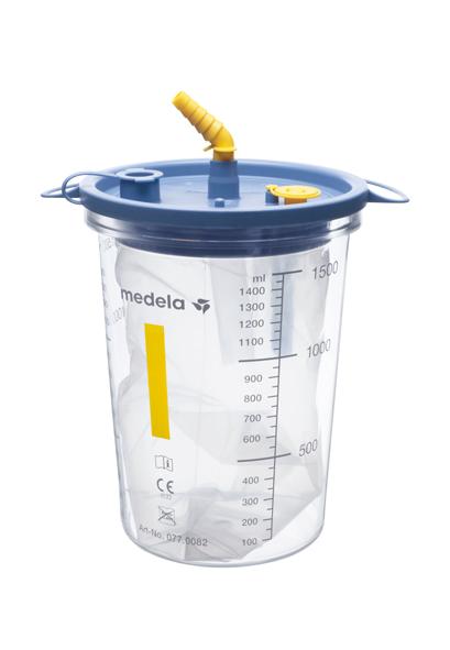 Zbiornik wielorazowy do systemu jednorazowego firmy Medela o pojemności 1,5 litra. Wykonany z wytrzymałego poliwęglanu (PC). Posiada specjalną blokadę utrzymującą zamocowany zbiornik na standardowej szynie i umożliwiającą usunięcie wkładu jedną ręką. Port do połączenia podciśnienia umieszczony jest w zbiorniku, co umożliwia zmianę wkładu bez odłączenia drenu.