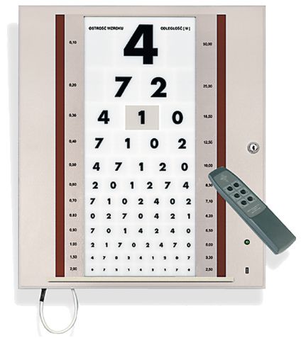 Sterowanie bezprzewodowe przy pomocy niewielkiego pilota na podczerwień. Program sterujący pracą tablicy pozwala podświetlić jednocześnie wszystkie znaki w jednym rzędzie lub podświetlić tylko jeden wybrany znak. Prosty montaż w gabinecie lekarskim. Wysoka niezawodność. Skrócenie czasu badania. Łatwa wymiana optotypów.