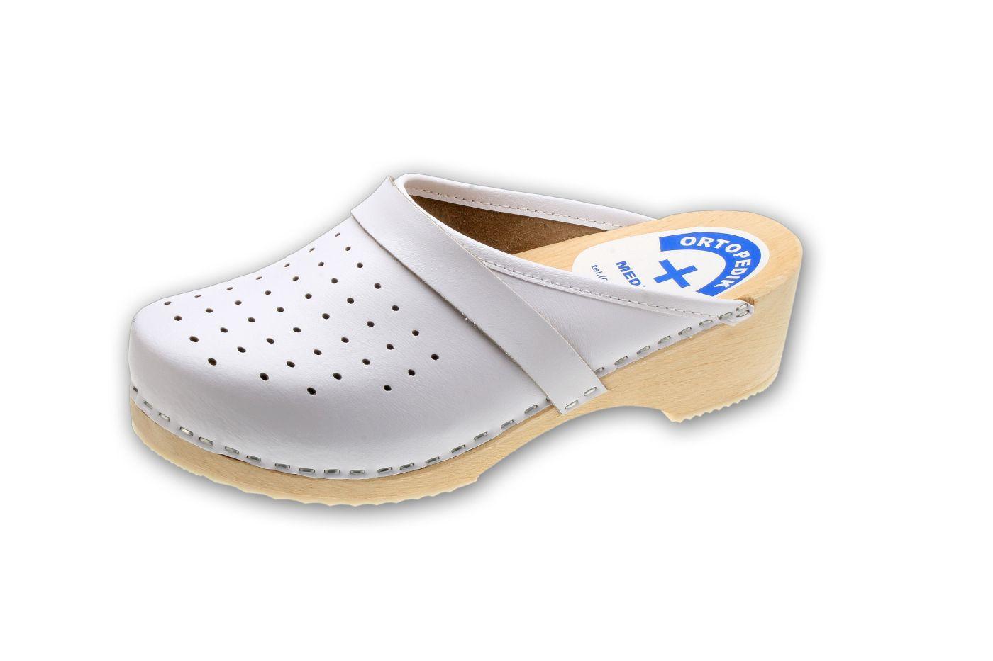 Pantolety zdrowotne (drewniaki) na spodach drewnianych z profilem ortopedycznym, podeszwą przeciwpoślizgową i cholewką skórzaną.