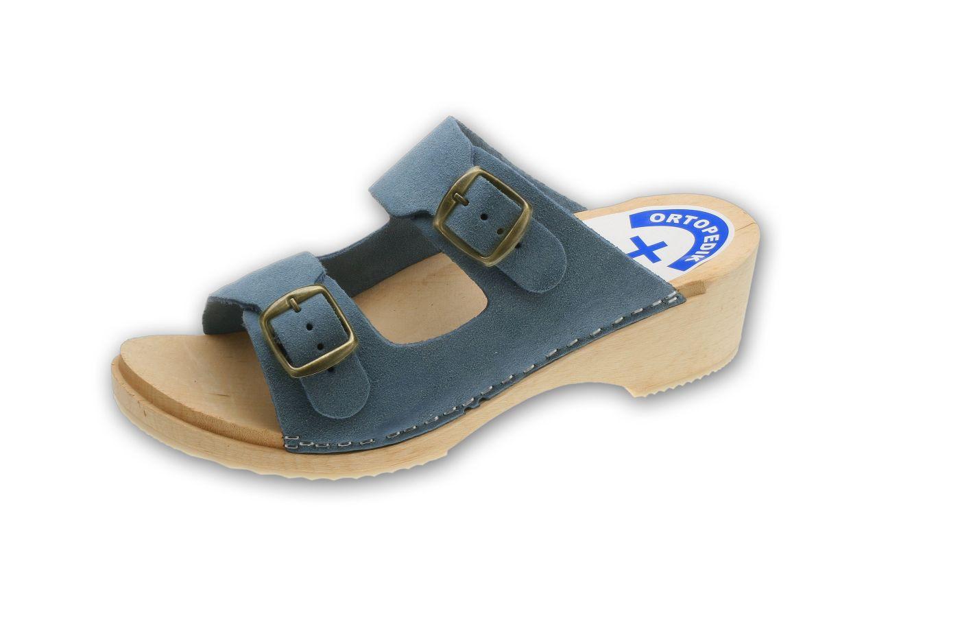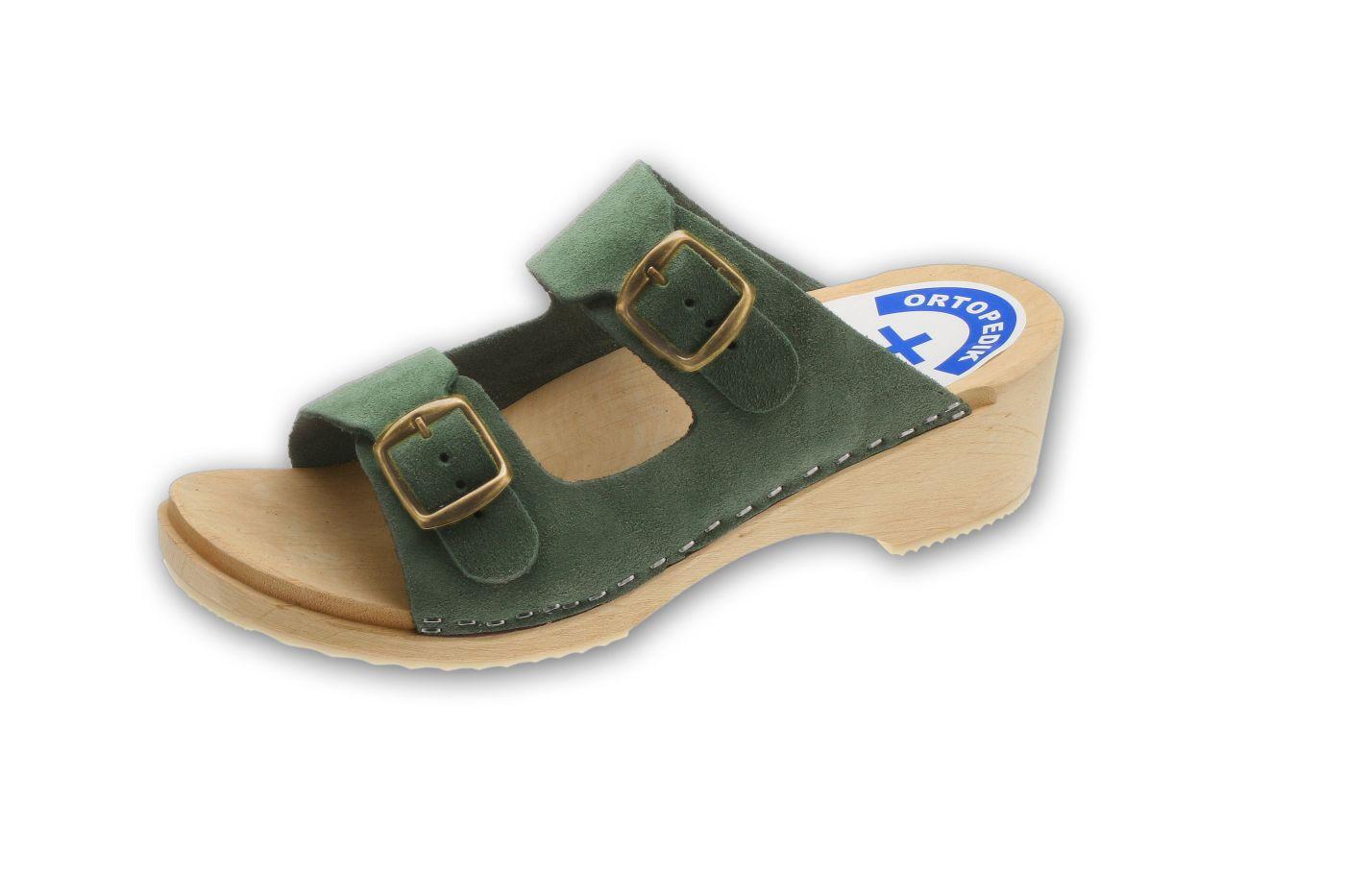 Pantolety zdrowotne (drewniaki) na spodach drewnianych z profilem ortopedycznym, podeszwą przeciwpoślizgową i cholewką skórzaną z regulacją tęgości. Cholewka z regulacją tęgości.