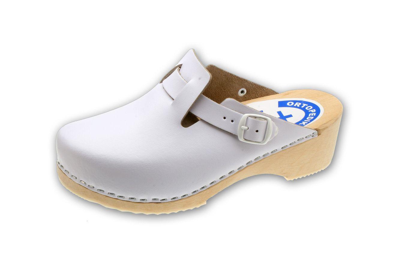 Pantolety zdrowotne (drewniaki) na spodach drewnianych z profilem ortopedycznym, podeszwą przeciwpoślizgową i cholewką skórzaną. Cholewka z regulacją tęgości, gładka lub z perforacją.