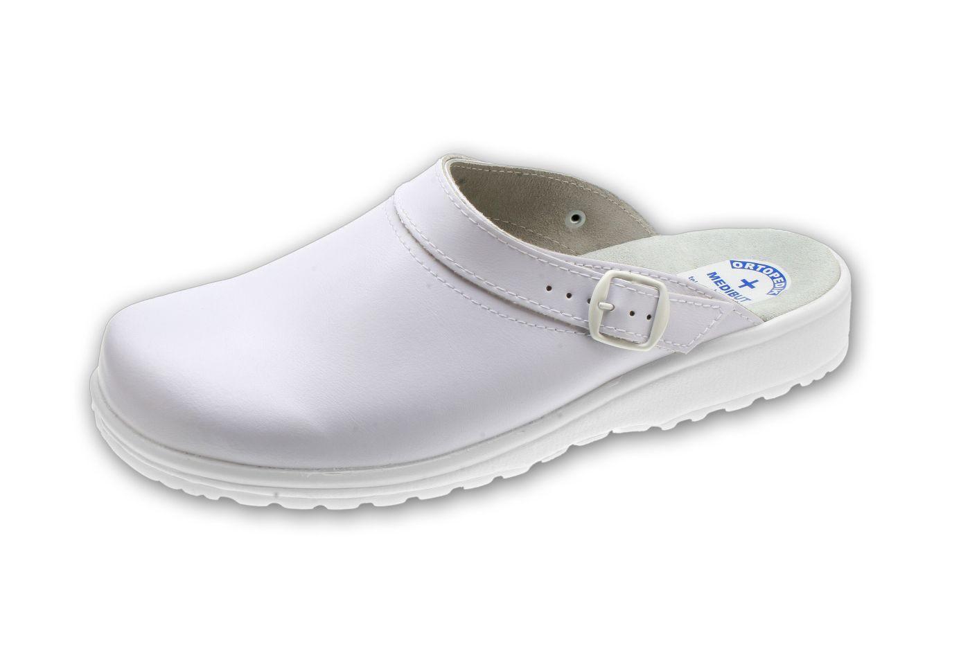 Obuwie damskie i męskie na spodach przeciwpoślizgowych z profilem ortopedycznym, cholewką i wyściółką skórzaną. Cholewka gładka.