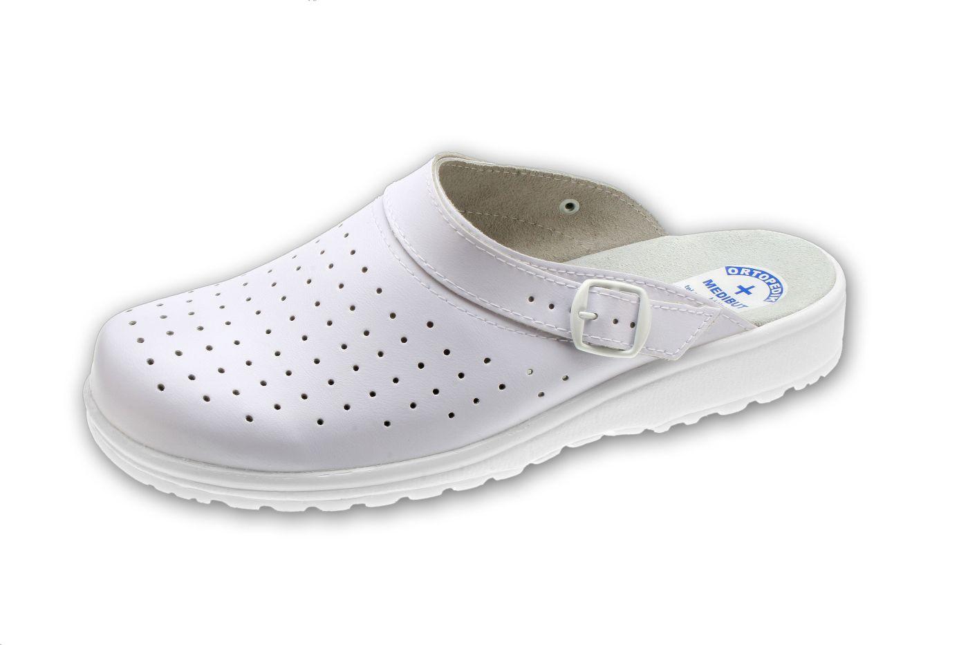 Obuwie damskie i męskie na spodach przeciwpoślizgowych z profilem ortopedycznym, cholewką i wyściółką skórzaną. Cholewka z perforacją.