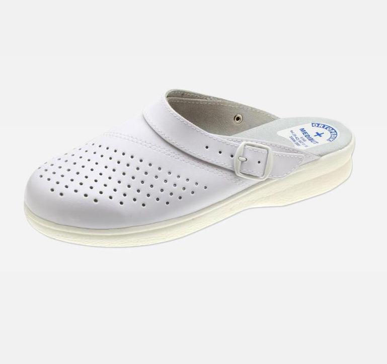 Obuwie damskie na spodach przeciwpoślizgowych z profilem ortopedycznym. Wyściółka i cholewka skórzana. Pasek dwufunkcyjny przekładany na piętę, cholewka gładka lub z perforacją bez regulacji tęgości