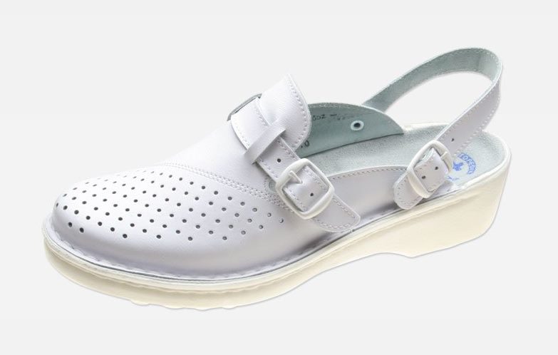 Obuwie damskie przeszywane, na spodach przeciwpoślizgowych z profilem ortopedycznym. Wyściółka i cholewka skórzana, możliwość regulacji tęgości. Cholewka z perforacją.
