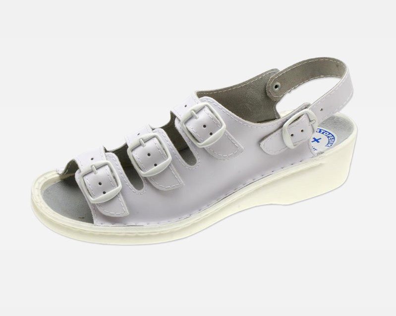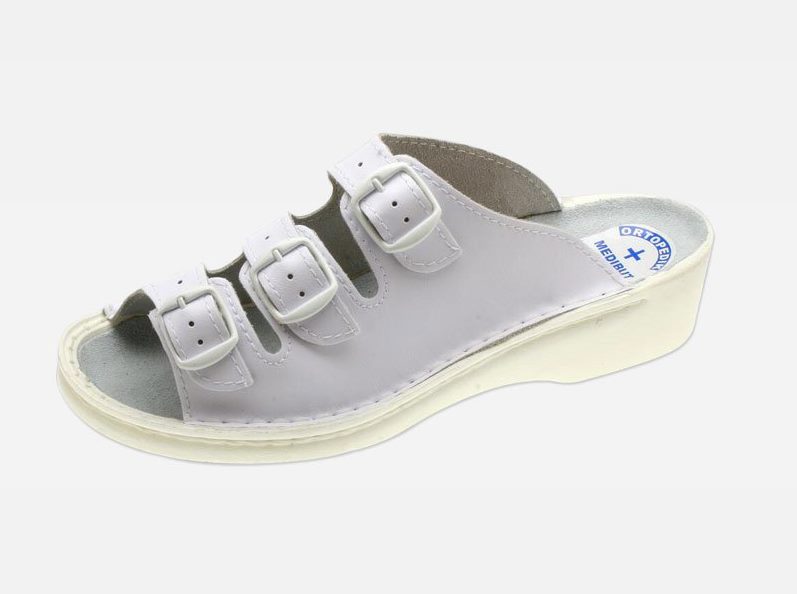 Sandały damskie przeszywane, na spodach przeciwpoślizgowych z profilem ortopedycznym. Wyściółka i cholewka skórzana, możliwość regulacji tęgości.