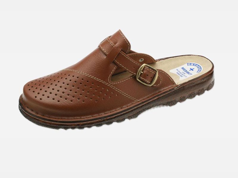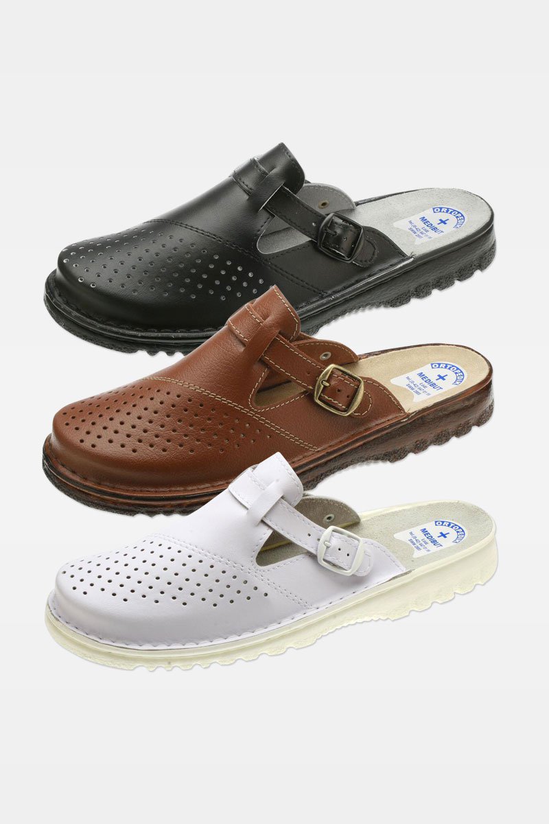 Obuwie męskie przeszywane, na spodach przeciwpoślizgowych z profilem ortopedycznym. Wyściółka i cholewka skórzana, możliwość regulacji tęgości. Cholewka gładka lub z perforacją.