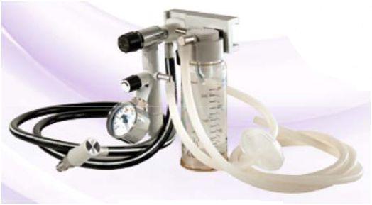 Ssak inżektorowy, zasilany z gniazda spężonego powietrza lub tlenu. Montowany na szynie, wyposażony w zbiornik zabezpieczający, filtr bakteryjny i przewód silikonowy o średnicy 6 mm.