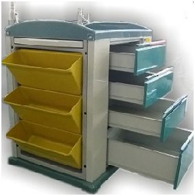 Wózek Reanimacyjny Medilife. Szkielet z ABS, wypełnienie stalowe. Blat roboczy plus dodatkowy, wysuwany blat. 4 przednie wysuwane szuflady. 3 boczne uchylne szuflady. Koła pokryte antystatyczną gumą wyposażone w hamulce. Wyposażenie opcjonalne: półka na defibrylator/monitor, wieszak na infuzję, akcesoria szynowe.