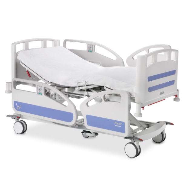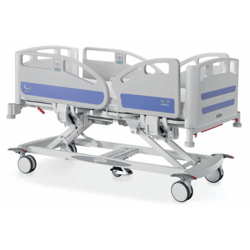 Czterosegmentowa powierzchnia pacjenta jest zabezpieczona czteroma niezależnymi barierkami bocznymi z wysokiej jakości HDPE klasy medycznej. zgodne są z normą EN 60601-2-52 i gwarantują odpowiednie zabezpieczenie pacjenta. Posiadają one zintegrowany wskaźnik kąta nachylenia, dając lepszą kontrolę nad regulacją segmentów oparcia oraz pozycjami Trendelenburg’a i anty-Trendelenburg’a. W opcji radioprzezierny segment pleców z miejscem na kasetę RTG. Zintegrowane przedłużenie leża (± 20 cm). Podwójny automatyczny system regresji umożliwia regresję płaszczyzny tułowia (do 11 cm) oraz regresję nóg (do 7 cm) co pozostawia dodatkową przestrzeń wspierając ochronę przed odleżynami.